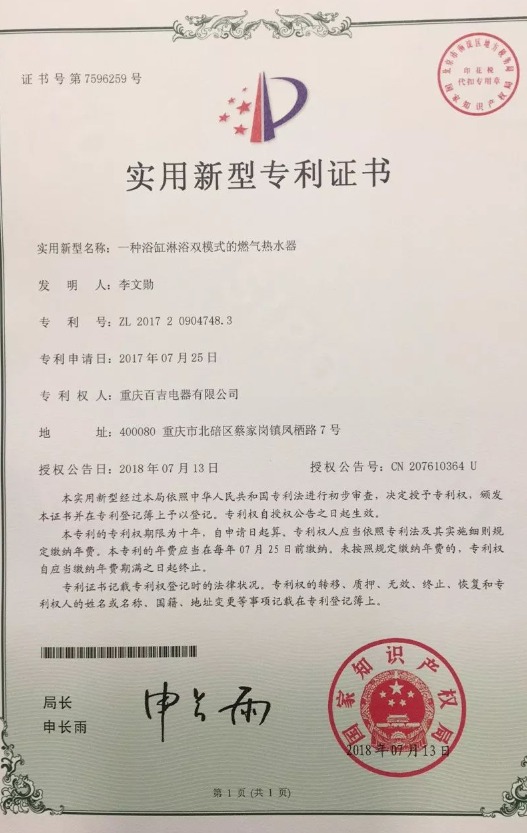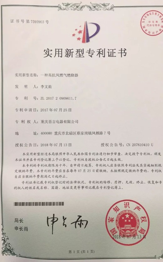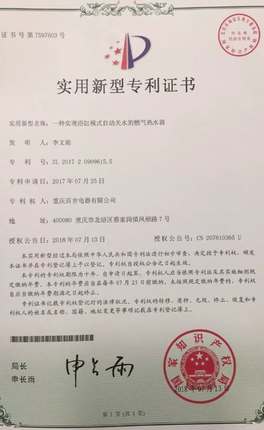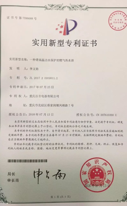 近日,百吉自主研發(fā)的多項技術(shù)通過了國家專利審查,喜獲授權(quán)!獲得專利的技術(shù)名稱分別是:一種高抗風(fēng)燃?xì)馊紵鳌⒁环N帶高溫出水保護(hù)的燃?xì)鉄崴鳌⒁环N浴缸淋浴雙模式的燃?xì)鉄崴饕约耙环N實現(xiàn)浴缸模式自動關(guān)水的燃?xì)鉄崴鳌?/span>